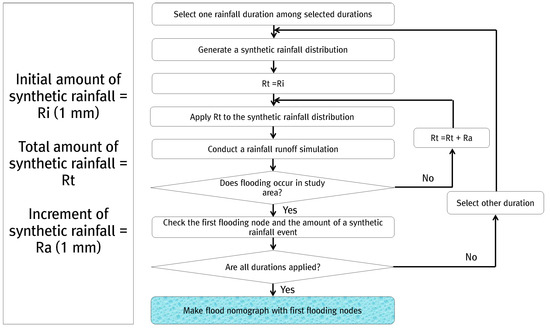 The initial amount of synthetic rainfall data in rainfall runoff simulations for the search of the first flooding node is 1 mm, which increases in 1 mm increments until flooding occurs. The first flooding node is selected, and its amount is checked when flooding occurs. The node where there is flooding is called the first flooding node when the flooding firstly occurs. The rainfall amounts of many first flooding nodes selected through this process are converted to rainfall intensities. The rainfall intensities constitute the flood nomograph, which is the threshold for flood forecasting. A flow chart for making a flood nomograph with the first flooding nodes is shown in Figure 2.