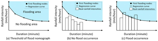 In Figure 3a, the rainfall amounts of the first flooding nodes are converted to rainfall intensities. Rainfall intensities are elements of the threshold in a flood nomograph. The threshold of a flood nomograph, as shown in Figure 3a, is generated from the regression curve of first flooding rainfall intensities. In Figure 3b, the rainfall intensities of the real rainfall event are lower than the threshold of the flood nomograph. This means that the real rainfall event is not extreme enough to cause floods in the target watershed. In Figure 3c, the rainfall intensities of the real rainfall event are higher than the threshold of the flood nomograph, which means that floods can be caused by the real rainfall event.