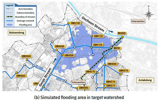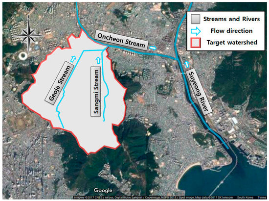 Korea has several metropolitan cities, such as Seoul, Busan, Incheon, Daegu, Ulsan, and Gwangju. Among these, Busan is the largest port city in Korea and has experienced several historical flood events. The Suyeong River flows through the center of Busan. This river has several tributaries, one of which is Oncheon Stream. Oncheon Stream also has tributaries, such as Geoje Stream and Sangmi Stream. Drainage areas adjacent to Geoje and Sangmi Streams were inundated in 2009. The upstream and midstream reaches of Geoje and Sangmi Streams are channels covered by roads. Downstream, the two streams join and flow into Oncheon Stream. Figure 4 presents geographical information regarding the target area.