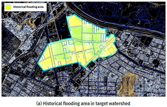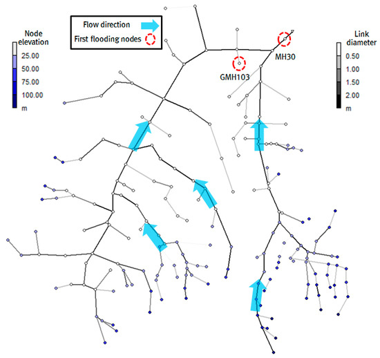 The outlet of the drainage network in the target watershed is located in the north of the target drainage area. Figure 5 includes additional information of the node elevations and link diameters. The slope in the target watershed is steep, so the time of concentration is short because the difference between the lowest and highest elevations is over 100 m. In the target watershed, the main conduits are rectangular and the branch conduits are circular. Figure 6 shows the validation of the drainage network matching the flooding area in the target watershed [22].