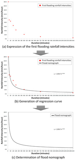 Generation of the flood nomograph required the regression curve from the first flooding rainfall intensities. The first flooding rainfall intensities were expressed in a graph, and the regression equation of the first flooding rainfall intensities was generated. The regression curve from the regression equation is the threshold for determining the flood forecast. The type of the regression equation is not limited, but the form of a power function can be recommended for easy application. Figure 7 shows the process of generating the flood nomograph.