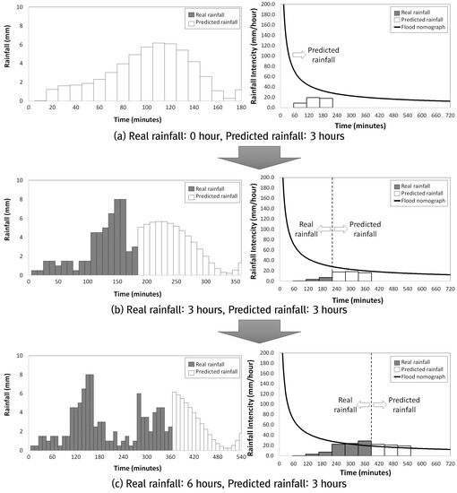 The historical rainfall data for 7 July 2009 was selected for application of rainfall data to the flood nomograph. The Korea Meteorological Administration provides a 3 h predicted rainfall to the public [23]. It is hard to show the details of all application processes because it is too long. If the applied rainfall data are for 1 or 5 min increments, precise flood forecasting is possible, though the process becomes long. Figure 8 shows the application of the flood nomograph.