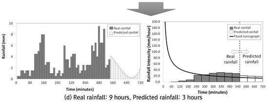 In Figure 8a, the predicted rainfall (3 h duration) is applied to the flood nomograph, and it shows the initial status of the application of the flood nomograph for flood forecasting. The predicted rainfall intensity shown in Figure 8a is lower than the threshold of the flood nomograph. In Figure 8b, the real rainfall (3 h duration) and predicted rainfall (3 h duration) are applied to the flood nomograph. The real and predicted rainfall intensities shown in Figure 8b are lower than the threshold of the flood nomograph. In Figure 8c, the real rainfall (6 h duration) and predicted rainfall (3 h duration) are applied to the flood nomograph. The real and predicted rainfall intensities shown in Figure 8c are higher than the threshold of the flood nomograph. This means that flooding is occurring and is predicted to continue. The results shown in Figure 8d are similar to the results shown in Figure 8c because the real (9 h duration) and predicted rainfall (3 h duration) intensities are higher than the threshold of the flood nomograph.