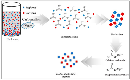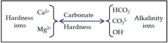Several studies have indicated a link between hardness concentrations (particularly calcium and magnesium) and cardiovascular diseases, Alzheimer’s disease and atopic eczema [3,4]. However, the link is tenuous, and many confounding variables exist in the studies [5]. Hard water is mainly caused by calcium and magnesium cations and to a lesser extent aluminum, iron and other cations. Calcium and magnesium are the two major cations responsible for hardness in natural water [6]. Therefore, for most waters, the total hardness is caused by major cations and associated anions as shown in Figure 1.
