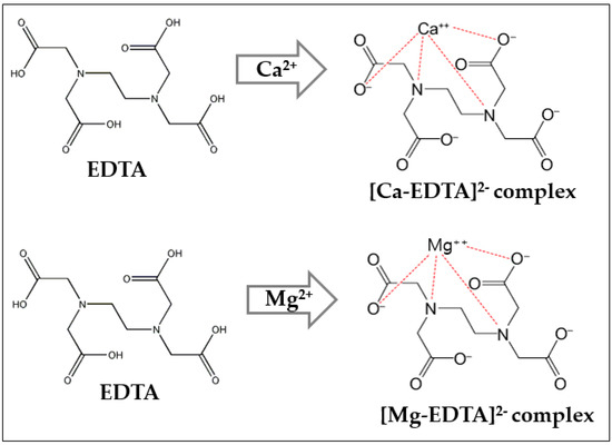 EDTA complex formation by the reaction with Ca2+ and Mg2+ ions.