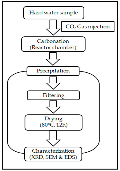 During the hard water carbonation process by the closed pressure reactor, three different CO2 flow rates were injected, giving different reaction times. The process involved 7 g/L CO2 for a 3 min reaction, 14 g/L of CO2 gas for a 4 min reaction and 21 g/L of CO2 for a 5 min reaction. The carbonation reaction began with the hydration of carbon dioxide in the water, which reacted with Ca2+ and Mg2+ ions to form calcium carbonate and magnesium carbonate precipitates. The effects of the carbon dioxide flow rate, the temperature at carbonation, and the pH on the precipitation formation were investigated. The pH values of all the samples were measured before carbonation and after the carbonation process with a pH meter (A 214, Orion, Thermo Scientific, Waltham, MA, USA).