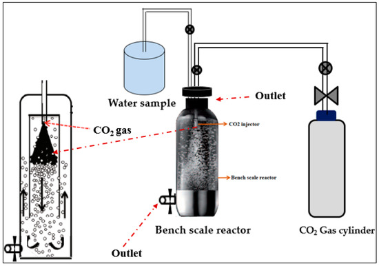 The Korea Institute of Geosciences and Mineral resources (KIGAM), has introduced a closed pressure reactor for the removal of hardness. This can be accomplished in conjunction with the coagulation of suspended solids, as shown in Figure 3. Here, a 1 L closed pressure reactor, with a maximum working CO2 pressure of 10 bar is used. It is connected with a CO2 cylinder containing 60 L of carbonated water, as shown in Figure 4. This closed pressure reactor, based upon a carbonation process, is used to control the concentrations of calcium and magnesium ions in hard water. In this carbonation process, 1 L of each water sample was brought into the reactor chamber and CO2 gas was injected using a CO2 injector machine. The closed pressure reactor has two alternative outlets for collecting the final precipitated solution. The upper outlet is for the bench scale reactor (1–2 L) and the bottom outlet is for the pilot scale reactor.