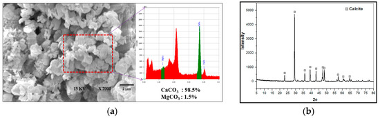 The crystallites formed join together to form polycrystalline particles with a rhombohedral shape. Re-crystallization takes place on the surface of the particles to create a very thin single-crystal shell, which then extends inwards, leading to true single crystals. Figure 5a shows the scanning electron microscopy (SEM) (JEOL Company, Seoul, South Korea) results of the rhombohedral calcium carbonate crystals and Figure 5b shows the X-ray diffraction (XRD) (Korea Institute of Geosciences and Mineral Resources (KIGAM), Daejeon, South Korea) analysis, which indicated that pure calcite was formed. The magnesium carbonate peak did not appear in the XRD results due to a low quantity of magnesium, but the energy dispersive x-ray spectroscopy (EDS) (Korea Institute of Geosciences and Mineral Resources (KIGAM), Daejeon, South Korea) results show a negligible quantity of magnesium.