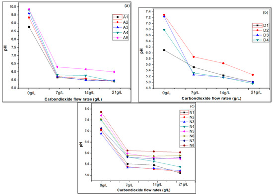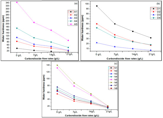 However, the water hardness gradually decreased in different artificial (A), drinking (D) and natural (N) water samples with increasing CO2 gas flow rates from 7 g/L to 21 g/L at room temperature, as shown in Figure 6.