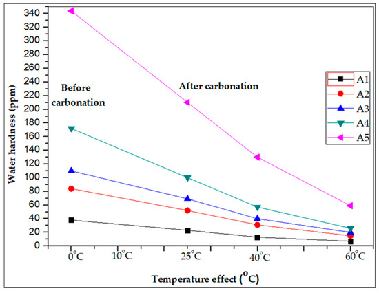 The five different artificial hard water samples were tested for reducing hardness with different temperatures: 25, 40 and 60 °C. The results clearly indicated that the hardness removal efficiency was enhanced up to 60–70% by the carbonation process with 21 g of CO2/L for 5 min reaction at 40 °C temperature and 80–85% hardness was reduced by carbonation process with 21 g of CO2/L for 5 min reaction at 60 °C temperature. These results clearly indicated that the water hardness gradually decreased with increasing temperature due to the reduction of Ca2+ and Mg2+ ions in the carbonation process, as shown in Figure 7.