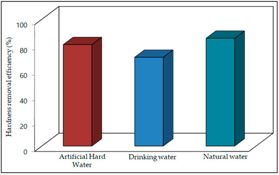 The hardness removal efficiency was 70–80% for artificial water samples, 60–70% for drinking water samples and 70–85% for natural water samples, respectively. The results are shown in Figure 9.