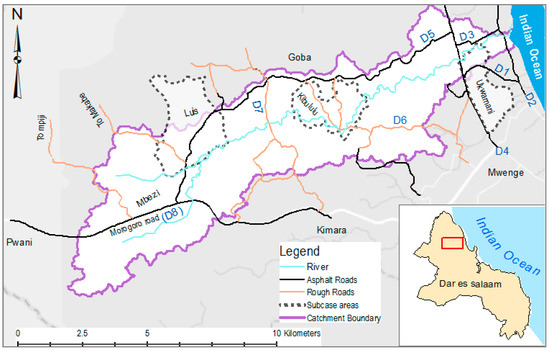 The maximum altitude of the catchment is 370 m above mean see level, while the average slope ranges from 7.5% in the upstream to 9% in the downstream. The area has a tropical coastal climate with mean daily temperature ranging from 17 to 33 °C and average humidity of 67–96% [37]. The mean annual rainfall ranges from 1000 to 1400 mm/year, distributed on two seasons, November to January (“short rains”) and March to May (“long rains”) [38], and the potential evaporation rate exceeds 2100 mm/year [39]. The dominant land use is residential, with a mixture of licensed and unlicensed plots, and small-scale vegetable farming. Being unplanned, the plot sizes are not standardized but varying, reflecting the purchasing power of the landowner, from approximately 225 to 625 m2 and with a building-to-plot-size ratio of more than 60% (field survey 2014, data not shown). Most of the buildings are permanent structures constructed of cement-sand blocks (100 mm × 210 mm × 440 mm from local markets), roofed with corrugated iron sheets. There are two main roads across the catchment, New Bagamoyo Road (D4) and Morogoro Road (D8), as well as a number of feeder rough roads (see Figure 1). Public drainage infrastructures are only provided for the major roads, labelled D1 to D8 in Figure 1. The study focused on the major roads and three selected sub-case areas, representing, respectively, the upper (Luis), middle (Kibululu) and lower (Ukwamani) parts of the catchment (Figure 1).