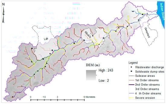 Mbezi River catchment boundary and its natural stormwater drainage routes, as revealed by hydrology tools of ArcGIS, are presented in Figure 2. It shows a well-drained catchment with up to four stream orders [42]. While the simulated fourth and third order streams, as well as most of the second order streams, overlaid perfectly with existing streams, most of the first order and a few of the second order streams could not be located on their predicted positions. In addition, several non-predicted first order streams were observed during ground truthing. Overall, the GIS-based map delineated the catchment and localized the natural runoff routes well and could serve as a base map. The banks of the main river were the most affected by erosion, followed by areas along the first and second order streams (Figure 2).