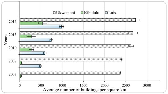 Bar graph comparing number of buildings per km2 in sub-case areas for the past 13 years. The whiskers indicate the standard deviation of three individual samples from the mean value. No image was available for Luis 2003.
