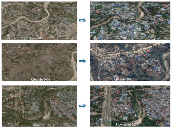 Urbanization trends from 2003 to 2016 in sub-case areas: Luis (top row); Kibululu (middle row); and Ukwamani (bottom row). Photos from: 2003 (left column); and 2016 (right column).