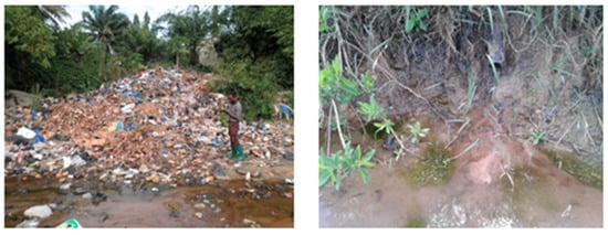 Field observations revealed a number of direct discharges of polluted water as well as piles of solid waste blocking many natural drainage routes, as illustrated in Figure 5. Further, some drainage routes were levelled out for building projects (data not shown). Concerning erosion, this was especially widespread in the middle catchment area. In all cases, erosion was caused by runoff creating deeper and wider gullies as routes merged on their downstream routes. According to the questionnaire survey more than 45% of the respondents settled in riparian areas used the erosion gullies and eroded parts of the river for solid waste dumping, assuming it to be a solution to erosion problems on their land properties.