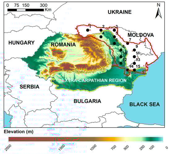The region focused on this study is the Prut River basin in Eastern Europe (Figure 1). The Prut River source is located in the Carpathian Mountains, Ukraine, and runs into the Danube River. It is circa 1000 km long, and its catchment area is 27,540 km2. The basin of the Prut River, being a transboundary basin, is located in the territory of three countries: 28% in Moldova; 33% in Ukraine; and 39% in Romania (Figure 1). The Romanian territory is divided by the Carpathian Mountains into two groups of regions: the intra-Carpathian regions and extra-Carpathian regions. The extra-Carpathian regions cover the southern, eastern, and southeastern parts of Romania, while areas located inside the mountain chain and those located westward from the mountains are considered the intra-Carpathian regions (Figure 1). The Carpathian Mountains form an orographic border which imposes a separation between the regions influenced by mild oceanic (south and west) and continental (north and east) climates. In the last 20 years, a shift from oceanic to continental climate can be seen, especially in the Romanian part of the Carpathians []. The extra-Carpathian regions (delimited area in Figure 1), which include most of the Prut basin, are more often influenced by southern tropical or eastern continental air masses []. The maximum flow of the Prut River is recorded during the beginning of the warm season, often in early April due to the significant quantities of precipitation overlapping with snowmelt, and manifests itself as spring–summer floods []. Although the Prut watershed has a relatively low water stress under present climate, a more detailed assessment is needed of this basin since its watershed has been exposed to landscape changes that may increase the runoff and reduce reservoir capacity []. Corduneanu et al. [] studied the Prut river flow recordings during the period 1978–2012 and noticed that two extremely severe droughts occurred, one spanning from 1982 to 1988 and more recently another that began in 2011 and continued until the end of 2012. In addition, Croitoru et al. [] studied the spatiotemporal distribution of aridity indices based on temperature and precipitation in the extra-Carpathian region of Romania and found that the southeastern region, including the Prut basin, are most vulnerable to semi-aridity, especially during the warm period of the year.
