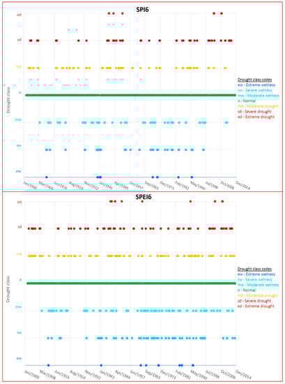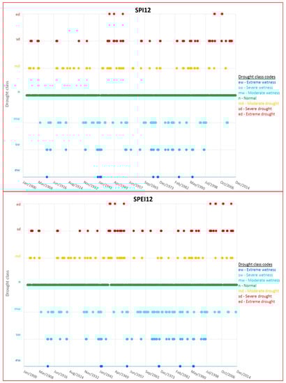 The monthly drought classes’ time series were categorized considering the limits defined in Table 2 reflecting the modifications described before, relative to both SPI and SPEI time series with 6- and 12-month time scales.