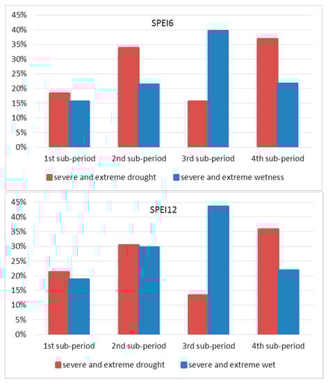 When comparing the SPI6 with the SPEI6 (Figure 2), it is evident that the SPEI6 identifies slightly more severe and extreme droughts than the SPI6. The same seems to happen for severe and extreme wetness conditions. Regarding the temporal 12-month time scale (Figure 3), the same is true but the difference between both is slighter.