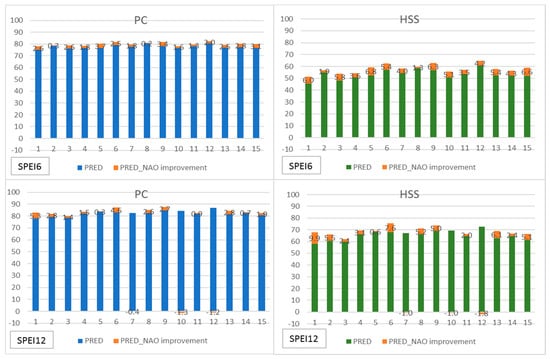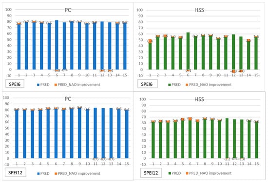 PC and HSS improvement (%) considering the influence of NAO on the SPEI6 and SPEI12 modeling for all months for each of the 15 grid points.