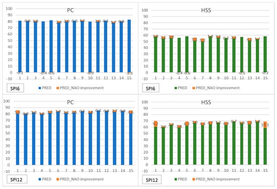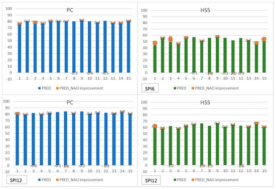 PC and HSS improvement (%) considering the influence of NAO on the SPI6 and SPI12 modeling for all months for each of the 15 grid points.