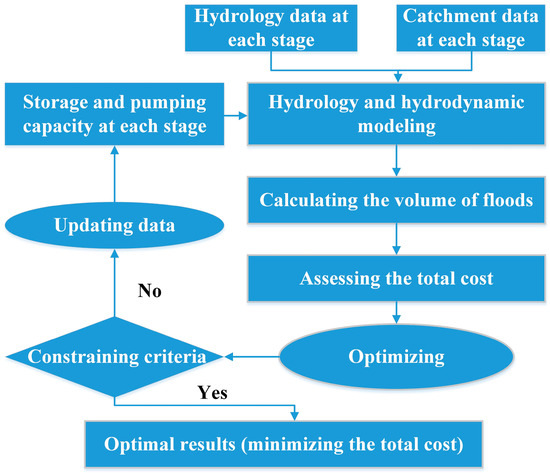 Two key measures, storage and pumping, are implemented to update the current drainage systems in Fuzhou City, China. The diagram of a staged optimization model is given in Figure 1.