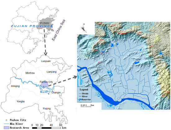 The study area, Fuzhou City is in eastern China and is surrounded on three sides by hills in the north, west, and east, and by a tidal river in the south. The area of Fuzhou is about 156.77 km2 with a hilly area of 66.72 km2 (42.56%) around a plain area of 90.05 km2 (57.44%). In the study area, dozens of conduits and rivers forming a complex drainage network undertake the main task of flood drainage (Figure 2). Heavy rains hit this city often quite abruptly in the summer seasons, with extreme rainfalls brought by typhoons. Due to the topography of this area, the floodwater would quickly converge into the center plain area from the surrounding mountains during the rain events, which increases the drainage burden in the center of the plain area. In recent years, flooding events have been frequently reported due to the overflow of the river systems in the center of this area during typhoons. The flood disasters cause huge socio-economic losses and seriously affect the activities of residents. For example, the 2005 flood event brought by Typhoon Longwang resulted in over 120,000 people evacuated and 62 dead [4].