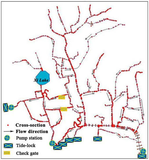 Statistically, the main reason for flooding in Fuzhou City is overflow from the complex river systems under the effect of intense rainfall. Thus, the hydrodynamic model for simulating the river system is constructed by the HEC-RAS tool [34], as shown in Figure 3. This model consists of 1713 cross-sectional profiles, three pump stations, and seven tide-locks downstream. Manning roughness coefficients with a calibrated range of 0.025 to 0.045 are provided by the Department of River Management of Fuzhou.
