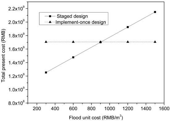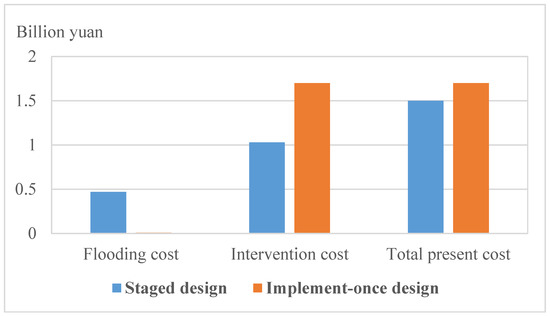 Based on the optimal solutions, the total present cost is calculated at 1.50 billion yuan, with the total present flooding cost of 0.47 billion yuan and the total present intervention cost of 1.03 billion yuan (Figure 4). In contrast, the total present cost would be 1.70 billion yuan if the interventions were completely implemented in the first year to meet the objective design standard. Figure 4 shows that the staged design is more economic than an implement-once design in the first year because the time value of money is considered.
