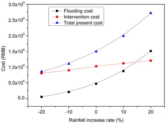 According to Saltelli et al. [37], “the sensitivity analysis is defined as the study of how uncertainty in the output of a model can be attributed to different sources of uncertainty in the model input”. In the context of the present study, sensitivity analysis refers to understanding how the parameters and states (optimization design variables) of the model (Equations (6)–(10)) influence the optimization cost function (Equation (6)). The data on environmental changes, climate change and urban economic development include uncertainties that come from the incertitude of the data on rainfall increase rate, flood unit cost, storage unit cost, and discount rate. A sensitivity analysis was carried out in order to examine the influence of the above parameters on the optimization cost function, as shown in Figure 5, Figure 6, Figure 7 and Figure 8.