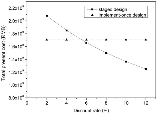 Besides, the staged approach is flexible to adapt to environment changing for urban flood management. It allows managers to perfect some schemes made today in terms of more comprehensive information for better decisions at a future date. For example, the measures for flooding preparedness which are adequate during the first 20 years of the implementation of the project may no longer be adequate in the following ten years due to climate change. Thus, a staged increase of the size of drainage facilities, such as detention storage and infiltration ponds, can be implemented as supplemental measures in different stages in the future. Also, if the 24-h design rainfall of the 50-year return period increases rapidly and significantly (e.g., with an increase of 10%) in the coming 15 years, the flood interventions should be implemented as early as possible rather than in a staged design. As shown in Figure 5, the total cost increases by 81.5% with an increase of design rainfall from 0 to 20%. In contrast, while the discount rate increases from 2% to 12%, the total optimal cost would reduce to 60% by staged design, as shown in Figure 6. That means that in this situation the manager should make sure the staged design is fully implemented.