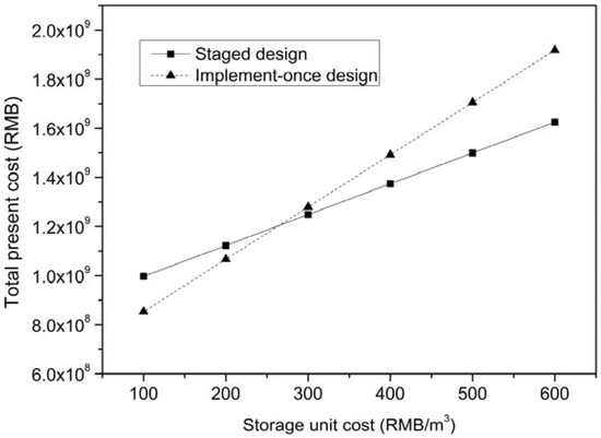 For Fuzhou City, the staged design can significantly reduce the total cost and help alleviate financial pressure compared to the implement-once design. Figure 6 and Figure 8 show that cost savings would be higher if the discount rate and storage unit costs increase. The findings of this design method may have important implications and contributions to urban flood management in the cities of developing countries with limited construction investments. This is the most important advantage of using staged optimal design.