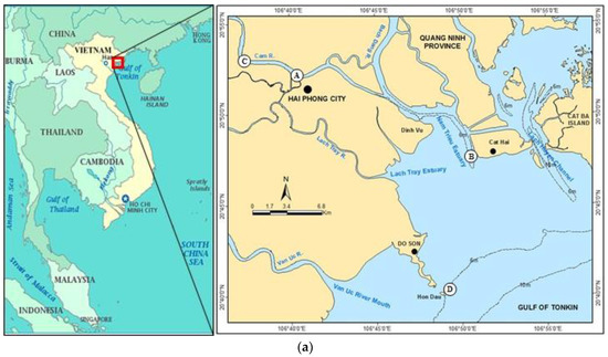 The Cam-Nam Trieu estuary is located in Hai Phong city (the third largest city of Vietnam), northeastern of Vietnam (Figure 1a). This estuary receives water and sediment from the Cam River and the Bach Dang River. The present study is based on measurements performed along the Cam River estuary and in the Nam Trieu estuary, this area is hereafter referred as the Cam-Nam Trieu estuary.