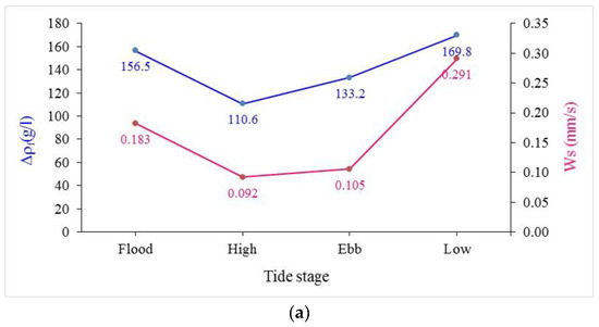 The settling velocity was evolving in the same way. Around the average value of 0.184 mm s−1, we obtained the highest value at low tide (0.29 mm s−1), then 0.18 at flood tide, 0.09 at high tide and 0.11 at ebb. Similarly to ∆ρf, ws was varying between 0.291 mm s−1 at low tide and 0.092 mm s−1 at high tide (Figure 2a), its value being 3.1 times higher at low tide than at high tide.