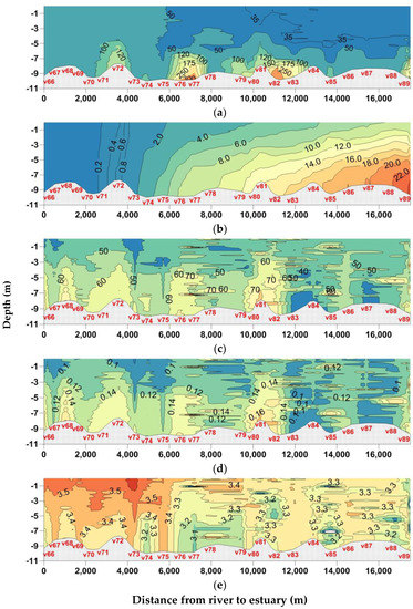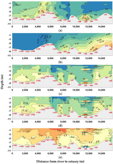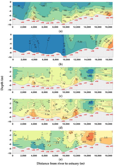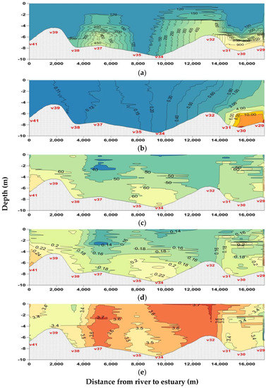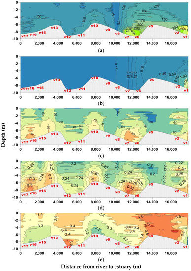 In the Cam-Nam Trieu estuary in May 2015, our measurements showed quasi-linear relationships between measured turbidity and SPM concentrations (Turb = 1.264 SPM + 18.30, N = 23, R2 = 0.971; or Turb = 1.392 SPM, N = 23, R2 = 0.957). Based on the relationship providing the best determination coefficient, SPM concentrations (mg L−1) were determined from the measured turbidity (FTU) profiles.