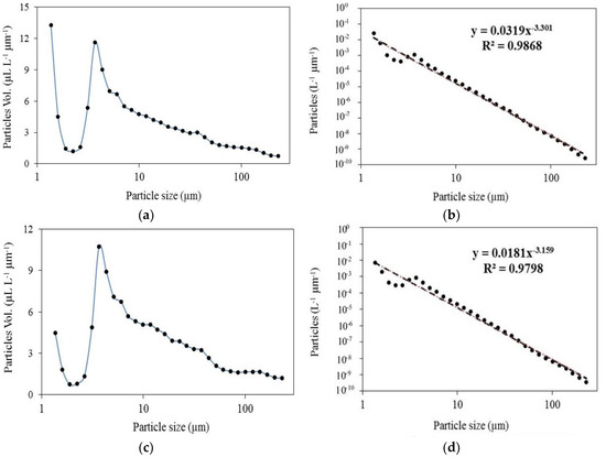 The number of particles of each class, N(D), was calculated from the volumetric particle size distribution (PSD) assuming spherical particles in the assemblage, after a normalization by the width of each logarithmically spaced size bin [47]. The more often, a power law relationship can be proposed between N and D following: