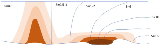 The convergence at the saltfront of landward sediment flux by the gravitational circulation and seaward sediment flux by the river flow is considered as a fundamental mechanism contributing to ETM formation [17,18,19]. In most estuaries, tidal resuspension has been recognized as a key factor in maintaining high SPM concentration [13,20,21,22]. Tidal asymmetry also contributes to the ETM formation. Tidal currents generally are surface-intensified at ebb but are bottom-intensified at flood. Vertical mixing may also be suppressed at ebb and enhanced at flood, due to the interaction of vertically sheared tidal currents with the along channel salinity gradients [23]. The position of the turbidity maximum sometimes corresponds to the boundary between river water and sea water [6,10,14,24]. The suppression of turbulence by density stratification tends to keep the particles near bed at the convergence zone [25,26]. Lateral interactions between currents and topography also have the potential to enhance asymmetric sediment trapping [27,28,29].