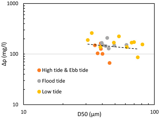 Where SPM was not measured but inferred from turbidity, ∆ρf was alternatively estimated using the fractal description of flocs. Kranenburg [64] derived the excess floc density ∆ρf of a floc composed of primary particles of diameter Dp and density ρp, with fractal dimension df: