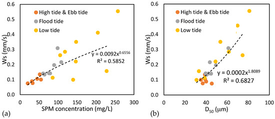 This formula was used to estimate the settling velocity of flocs [64,65,66,67]. In this study, it was applied with Dp = 4 µm (following Fettweis [68]: Dp = 1.1 µm in the ETM, 2.1 µm at the edge of ETM and 7.2 µm offshore), ρs = 2650 kg m−3 and ρ0 = 1100 kg m−3, like Maerz et al. [66] did, and df = 2 as suggested by Winterwerp [60]. Averaged values of ω amongst our measurements in May 2015 were considered for the applications (ω = 0.89 at flood tide, 0.85 at high and low tides, 0.91 at ebb tide).