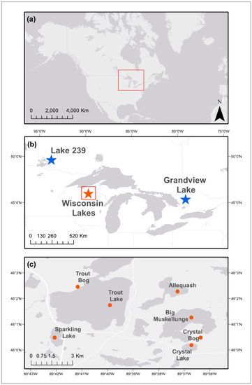 Maps of (a) North America (the red box indicates the location of the study regions); (b) the study regions in Ontario, Canada (blue stars) and Wisconsin, USA (orange star); and (c) a close up of the seven study lakes in northern Wisconsin.
