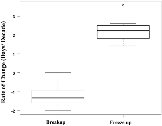 We used Sen’s slopes to calculate trends in lake ice breakup and freeze up between 1981 and 2015 using the “openair” package in R [42]. Sen’s slopes are a nonparametric method of statistically testing trends. The Sen’s slope is the median of the slopes calculated between each pair of points [43,44]. This analysis has previously been used to discern temporal trends in ice phenology [4,45].