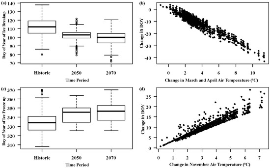 (a) The timing of lake ice breakup (day of year) for the historic period (1981/2–2014/5), and forecasted in 2050, and 2070; (b) Forecasted change in the day of ice breakup with the corresponding change in mean March–April air temperature under 126 projected climate scenarios; (c) The timing of lake ice freeze up (day of year) for the historic period (1981–2015), 2050, and 2070; (d) Forecasted change in the day of ice freeze up with the corresponding change in mean November air temperature under 126 projected climate scenarios.