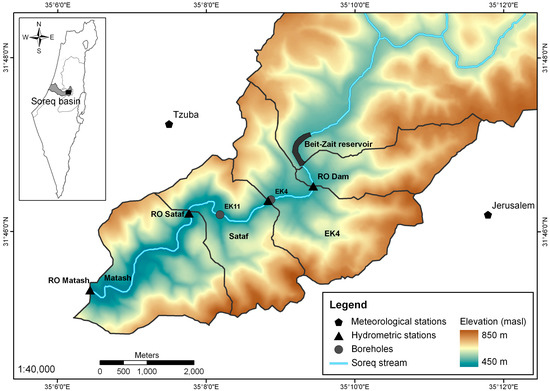 The study area is located on the Soreq creek, an ephemeral stream that runs westward of the city of Jerusalem, Israel (Figure 1). At this site, the Soreq creek drains a catchment area of approximately 99 km2. The upper part of this catchment area (78 km2) drains runoff water into a reservoir (Beit Zait, Israel) that limits downstream natural surface flow. The channel length from the reservoir up to the study area outlet is 7.25 km, with a mean channel slope of 1.2%. The hillslopes in this part of the catchment have a mean slope of 29%. The mean annual precipitation in this area, according to the IMS Jerusalem meteorological station for 1980–2010, is 537 mm. Over 70% of the annual rainfall occurs during December–February. Although the stream has no base flow, the area experiences intense rainfall events which can cause the reservoir dam to overflow, which then develops into floods downstream. Such events occur every few rainy seasons, e.g., according to readily available data, between 2004/05 and 2014/15, the dam overflowed five times in three hydrological years. The floods are characterized by narrow flood peaks with short time lags. During the spring season, water is regularly released from the dam downstream.