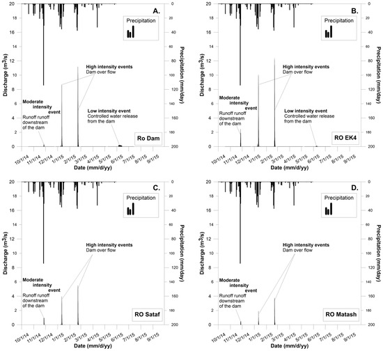Observed runoff discharge at the (A) RO Dam; (B) RO EK4; (C) RO Sataf; and (D) RO Matash gauging stations, and measured daily rainfall data from Tzuba Meteorological station.