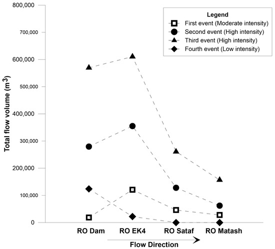 Total runoff volumes along the creek also varied during each event between the RO stations (Table 2). In both high intensity (second and third) events, similar patterns of total flow volume fluctuation were observed along the creek (Figure 3). In both events, the total flow increased between the RO Dam and RO EK4 stations, increasing 7.2% in the second event and 27.1% in the third event. In the second event, a reduction in total flow volume was observed further downstream, at the Sataf and the Matash stations. Compared to the previous station, a 64.0% reduction in total flow was measured at the Sataf station, and a further reduction of 51.4% at the Matash station. During the third event, there was also an observed decrease in total flow volume downstream, where the total flow decreased 57.3% and 40.0%, from EK4 to the Sataf, and from the Sataf to the Matash stations, respectively. In both high intensity (second and third) events, the flow at the RO Dam gauging station was higher than the flow at the RO Sataf station, which implies high reach losses.