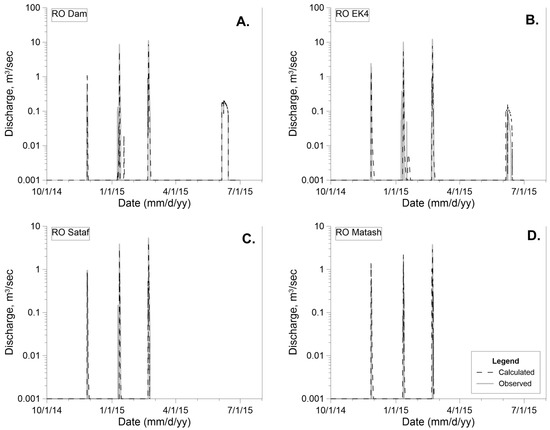 Observed and computed discharge at the (A) RO Dam; (B) RO EK4; (C) RO Sataf; and (D) RO Matash gauging stations.