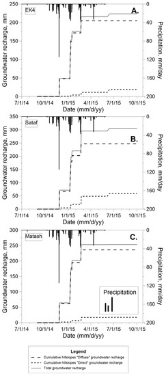Cumulative groundwater recharge in (A) EK4; (B) Sataf; and (C) Matash sub-basins.