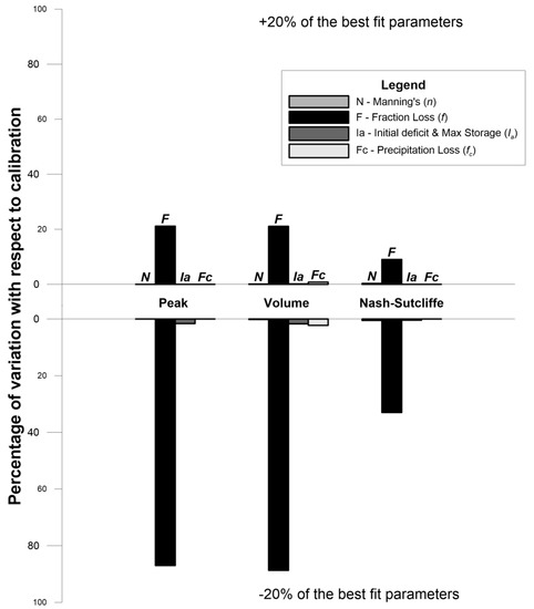 In order to examine the sensitivity of the flow model to parameter variations, parameters were varied within ±20% of their calibrated values. A sensitivity analysis was performed for the Manning’s roughness coefficient (n), the flow fraction loss coefficient (), the maximum soil storage parameter (), and the precipitation loss parameter (). The results of the sensitivity analysis show that the model is most sensitive to changes in the flow fraction loss coefficient, and least sensitive to changes in the Manning’s roughness coefficient, the maximum soil storage and the precipitation loss parameters (Figure 6).