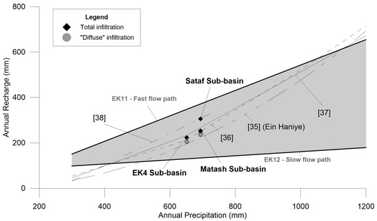 Computed annual recharge of total and diffuse infiltration at the EK4, Sataf, and Matash sub-basins over the expected recharge range (grey) at the study area [32]. The recharge range is between fast flow paths along conduits and slow flow paths through the matrix. EK11 and EK12 are sites that represent these two different types of flow paths, respectively.