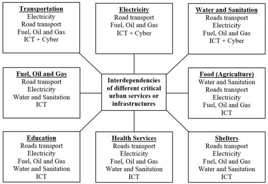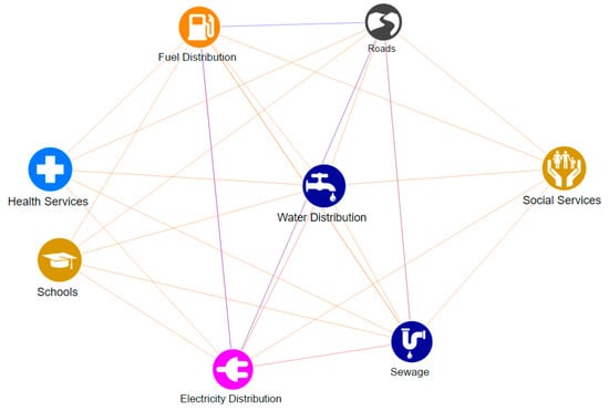 Rinaldi et al. [] (2001) identified four principal classes of infrastructure interdependencies: physical, cyber, geographic and logical. Physical interdependency arises from a physical linkage between the inputs and outputs of two agents: a commodity produced or modified by one infrastructure, as an output, is required by another infrastructure, as an input, for it to operate. Cyber interdependencies connect infrastructure to one another via electronic information such as the outputs of the information infrastructure are inputs to the other infrastructure, and the ‘commodity’ passed between the infrastructures is information. “Geographic interdependency occurs when elements of multiple infrastructure are in close spatial proximity” []. Logical interdependency is bidirectional and does not depend on any physical or cyber connection (e.g., electric power and financial infrastructure) []. However, in the work of [], the authors added two more types of interdependencies in addition to the policy or procedural and societal interdependencies [].